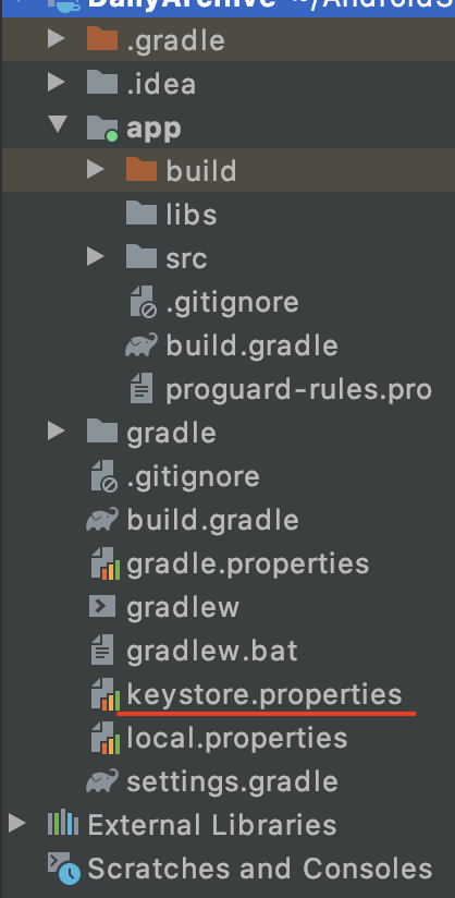 - 프로젝트 탭을 선택하신 후 루트디렉토리에다가 keystore.properties파일을 만들어줍니다.