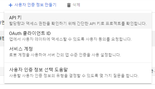 - "사용자 인증 정보 만들기"에서 API 키 클릭.